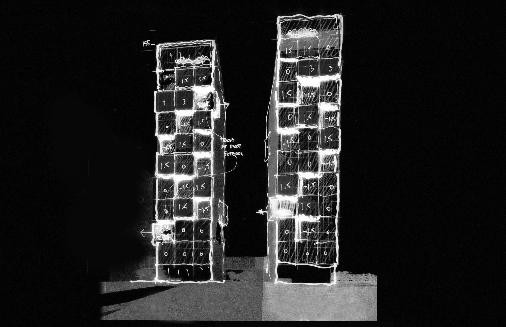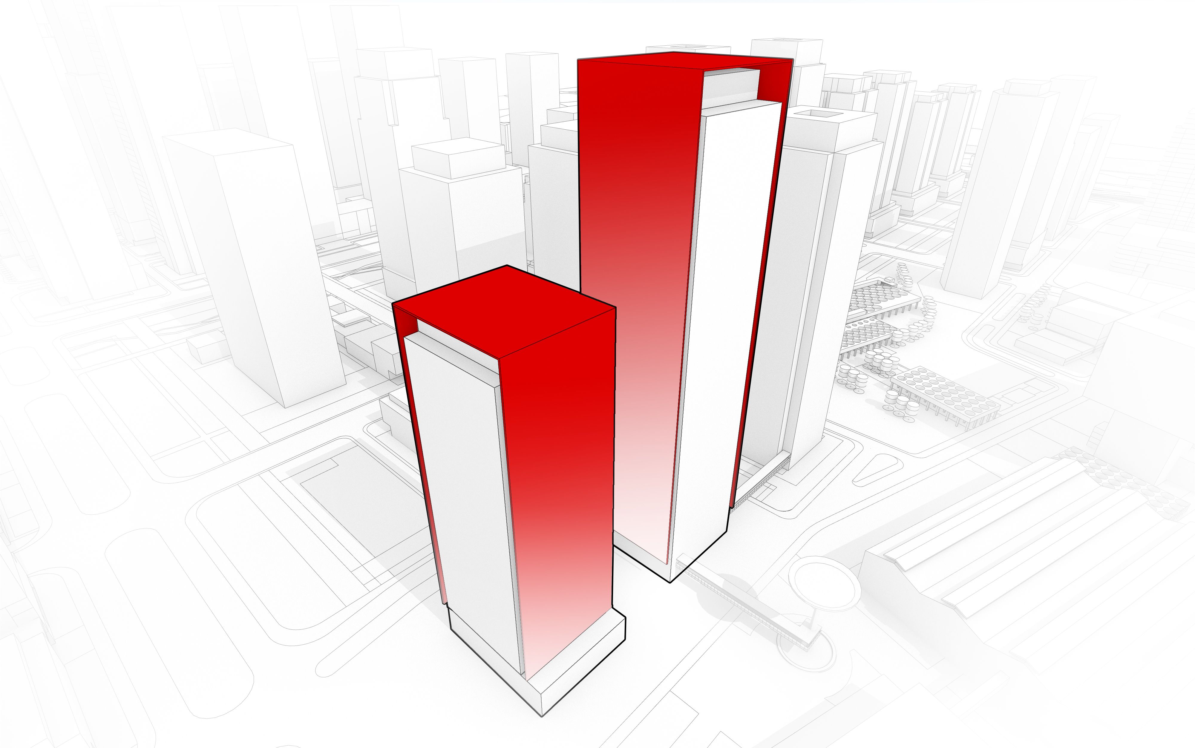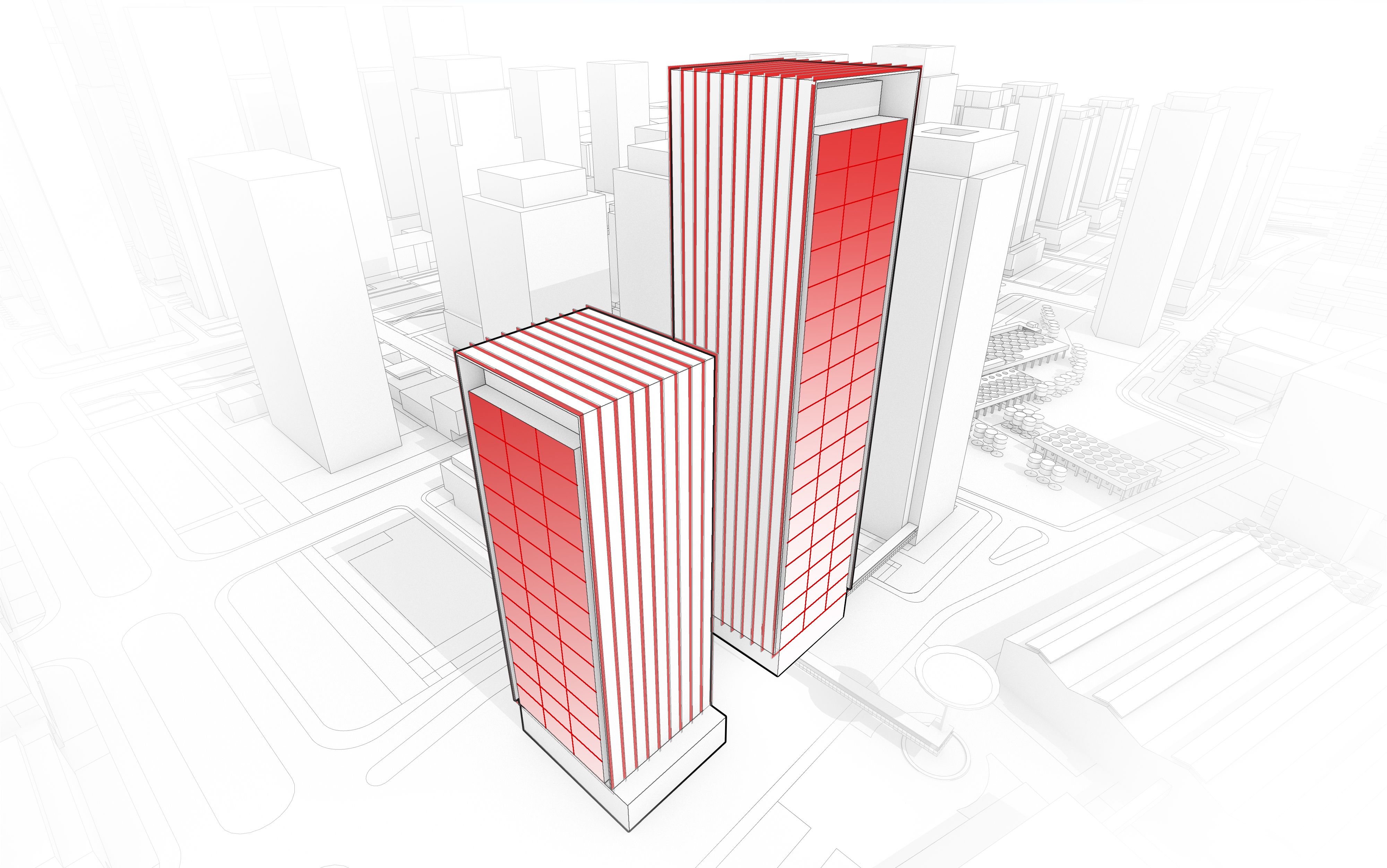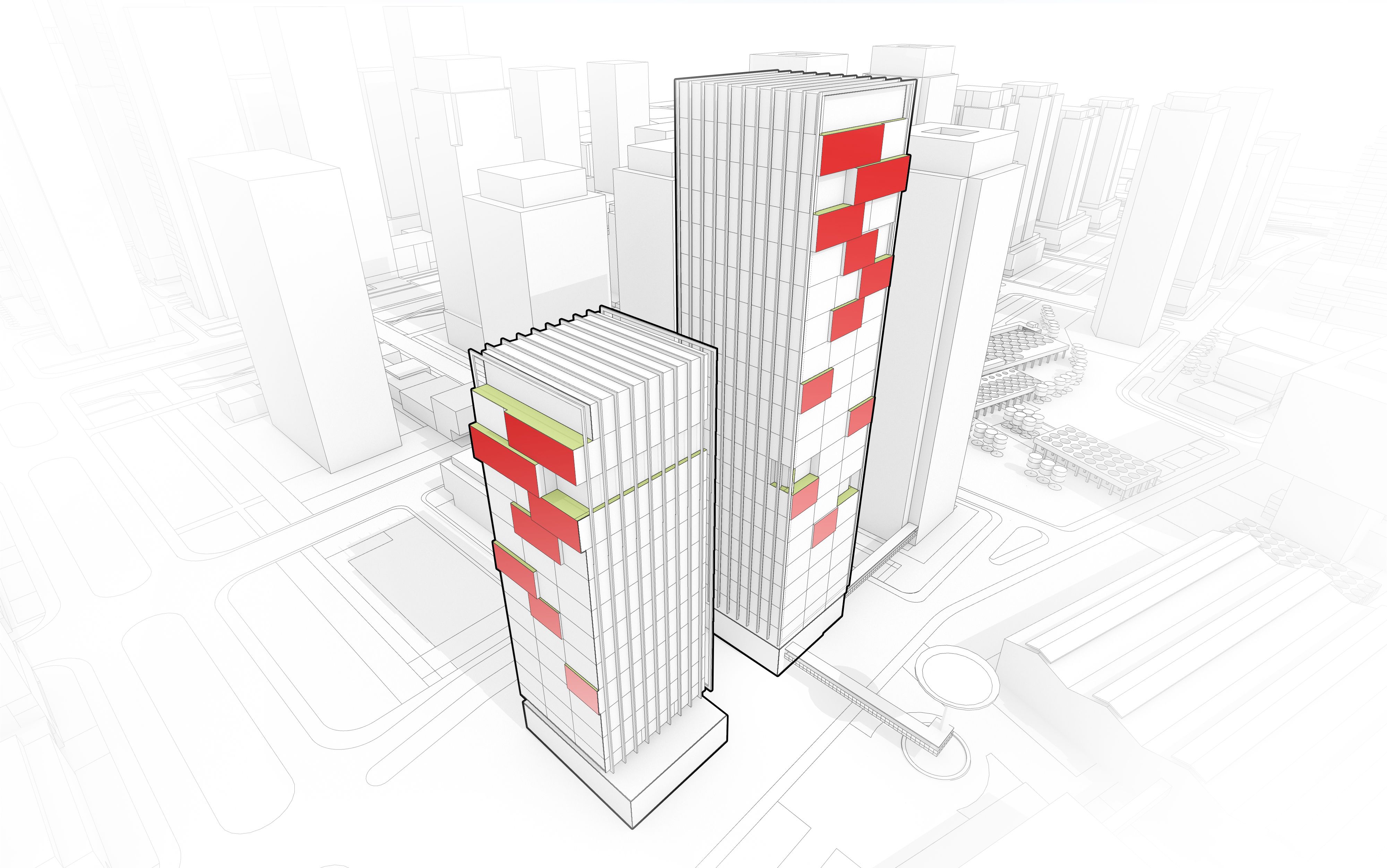 The architectural concept differentiates the towers through an A–B façade strategy. On the north and south elevations, a system of layered massing and framed landscape elements creates a composition of articulated volumes—“boxes” that project outward at varying depths, either as individual elements or clustered groupings. In contrast, the east and west façades emphasize vertical expression through a series of exterior fins that provide solar shading while preserving expansive views toward the river and park. Integrated terraces throughout the massing introduce opportunities for social interaction and informal gathering, strengthening the connection between the buildings and their immediate urban context.